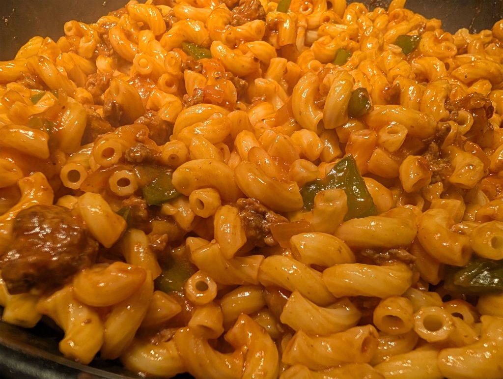 I have to say, I much prefer the tomato soup sauce in the Supper Dish recipe than the jarred sauce I used for the American Chop Suey. I find the latter to be acidic a lot of the times. The Supper Dish recipe is not acidic at all and sweet. I loved the addition of the green bell peppers and did not taste the garlic at all. So it is your choice whether to put the garlic or not as long as you limit it to 1 clove to one pound of ground beef.