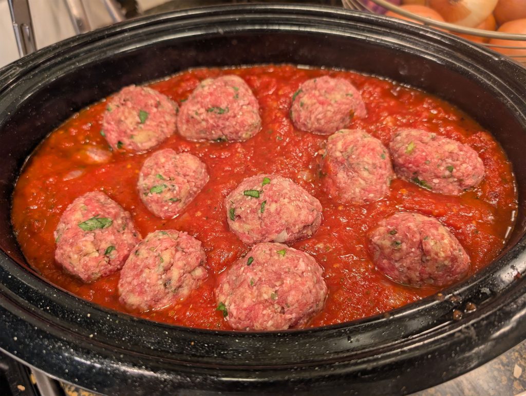 I always cook my meatballs in my Nesco Roaster Oven. I find that it is easier to control the heat and the risk of burning the meatballs on the bottom. I never fry or bake meatballs ahead of time. I don’t like the texture of the outside and don’t like the flavor the sauce gets with browned meatballs.
