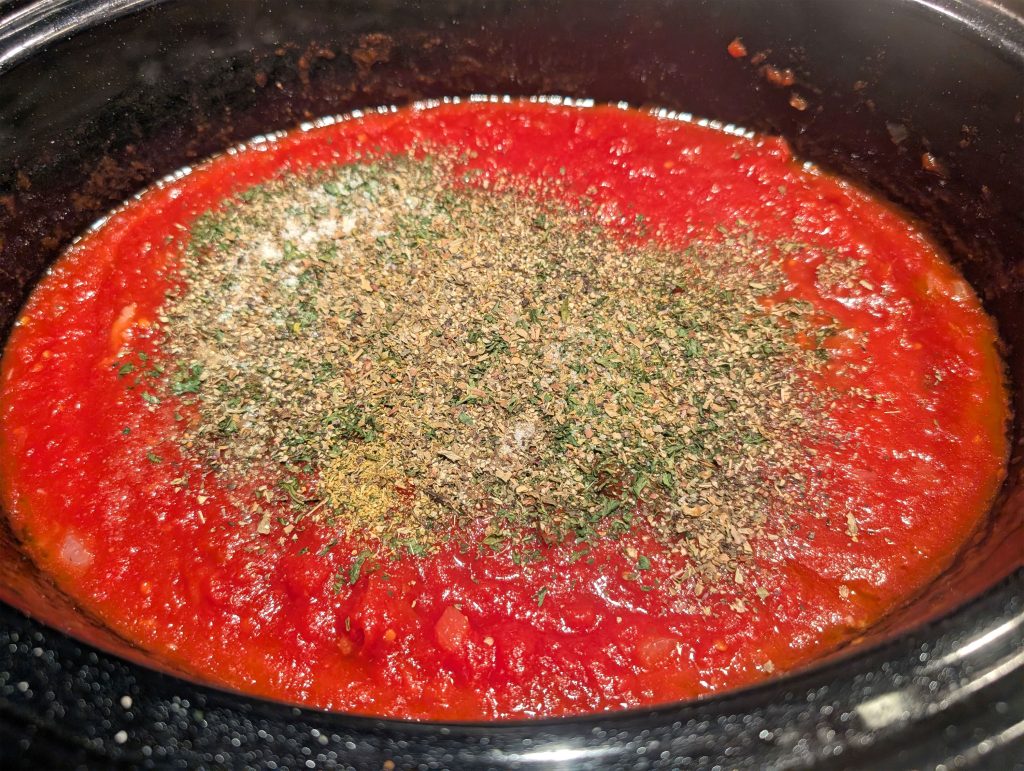 Then add the crushed tomatoes, the herbs and sugar. Heat until sauce is very hot. You want to put the meatballs into hot sauce.