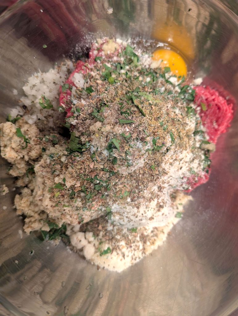 - In a very large bowl, add the ground beef, the bread crumb mixture, eggs, Parmesan cheese, herbs, garlic and minced onion. Mix together until fully incorporated.