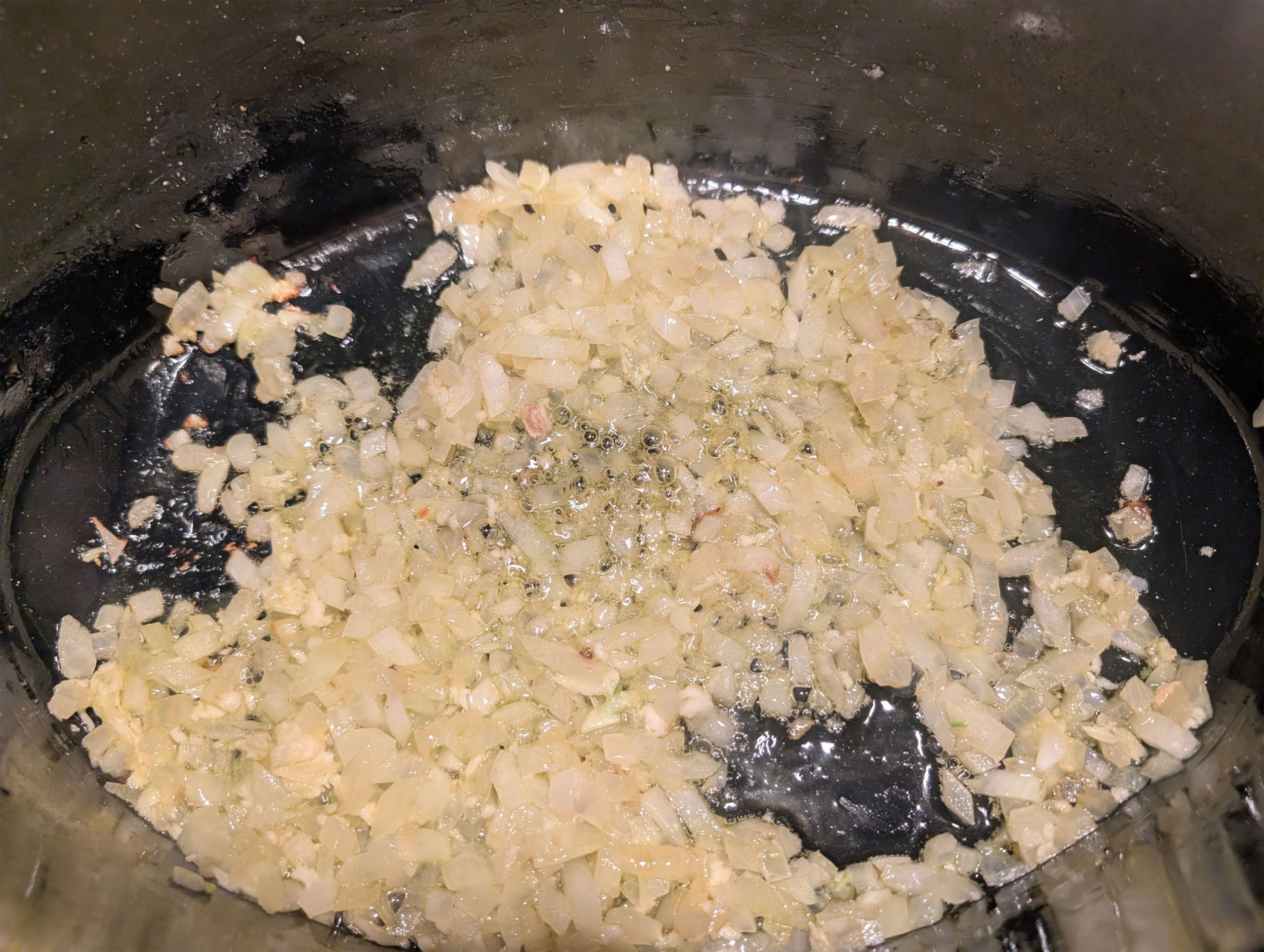 - Saute chopped onion in olive oil until starting to get soft and translucent. Add the minced garlic and saute just until it starts getting fragrant, about a minute. Don't let the garlic burn.